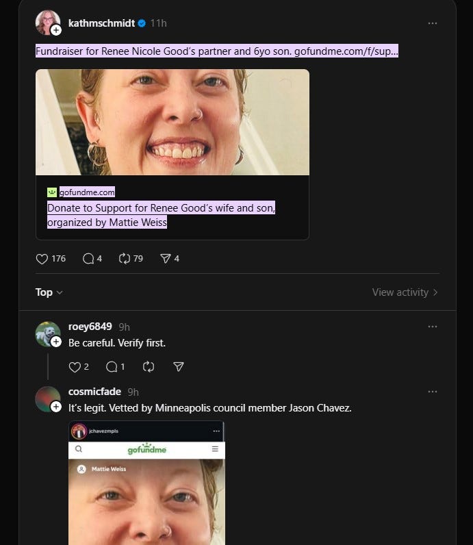 Give only through family-confirmed or journalist-verified GoFundMe or mutual-aid links. Avoid rushing to the first link you see shared widely. If you are unsure, pause. Verification protects families from exploitation. Verification does not require detective work just a moment of patience. Just check to see if it has been confirmed by family, attorney or reputable news. Then check links through a few sources not just one viral post. If there is a ‘give now or else’ vibe then wait a bit. Legitimate efforts remain active beyond the first wave of attention.